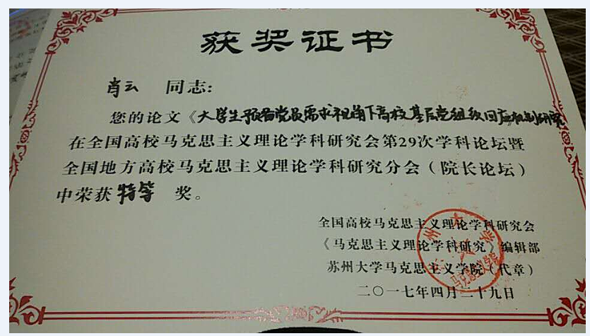 提交的学术论文《对马克思主义中国化的两点思考》、《穿越正义的幻象——马克思对资本主义分配正义的四重批判》、《< 共产党宣言>的马克思主义理论教育思想研究述评》都荣获“优秀奖”。
